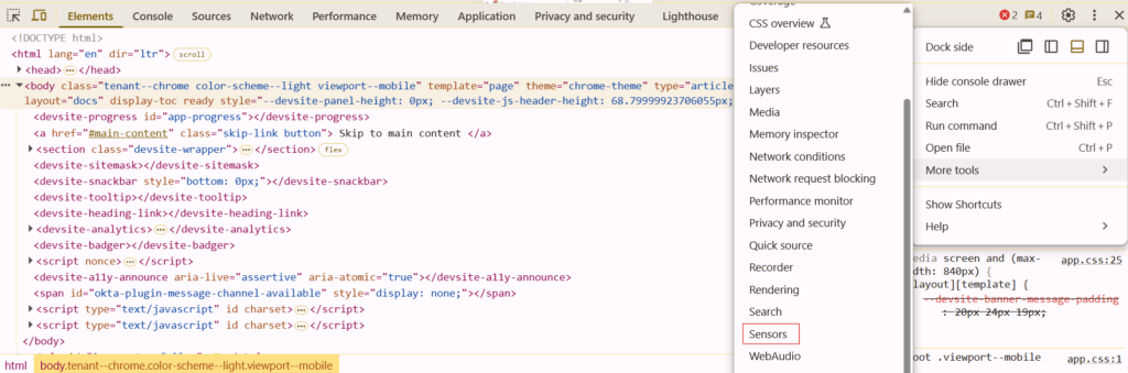 - (En las versiones más recientes de Chrome, vaya a la pestaña “Consola”, luego haga clic en el icono “>>” y seleccione Sensores).