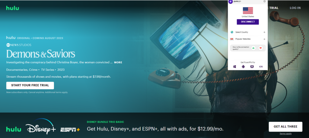 Demons and Saviors is available for free in the US on Hulu’s free trial if you are a new subscriber. However, if you live abroad, you must use a reliable VPN like PureVPN to bypass geo-restrictions and watch Demons and Saviors in the UK for free.