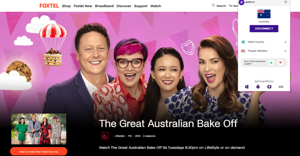 As much as all foodies must await the show, you must know that you might not be able to watch The Great Australian Bake Off Season 8 in the UK, as Foxtel Go only works in Australia. But don’t worry! With the help of a trustworthy VPN like PureVPN, you can easily access Foxtel Go worldwide and watch The Great Australian Bake Off Season 6 in the UK without any problems.