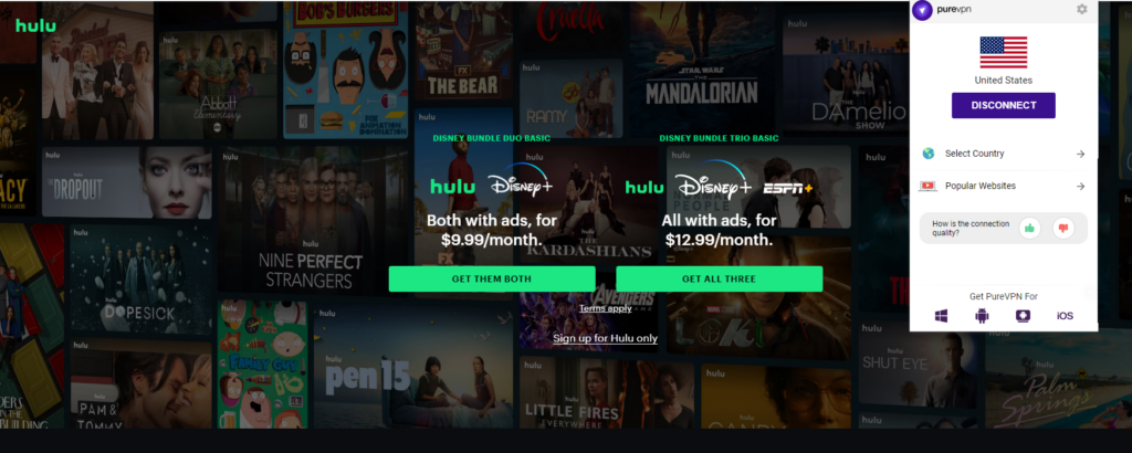 This is where our PureVPN comes in handy. This trustworthy VPN switches your virtual location to make you appear to be in the United States. Thus, Hulu is deceived into believing that you are a native US user, allowing you to access its content library and watch The Quiet Girl in the UK.