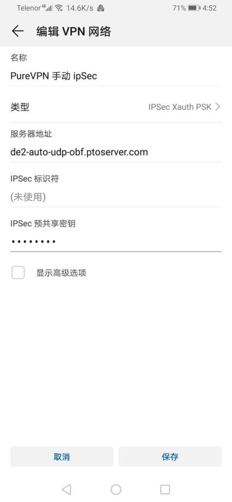 - 输入名称 : “PureVPN 手动 IPSec”。
