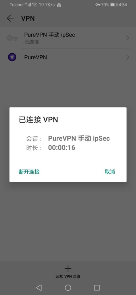 然后点击刚刚保存的PureVPN 手动 IPSec VPN网络并点击连接。