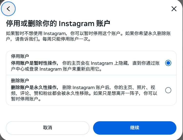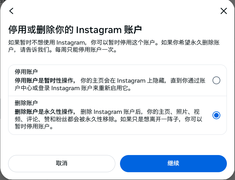 无论你的原因是什么,Instagram 都提供“删除”和“停用”两种方式,以下将逐一说明。
